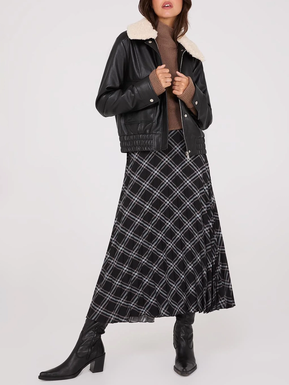 A staple you'll have in your closet for years, this faux leather jacket has a shearling collar for extra warmth and style.